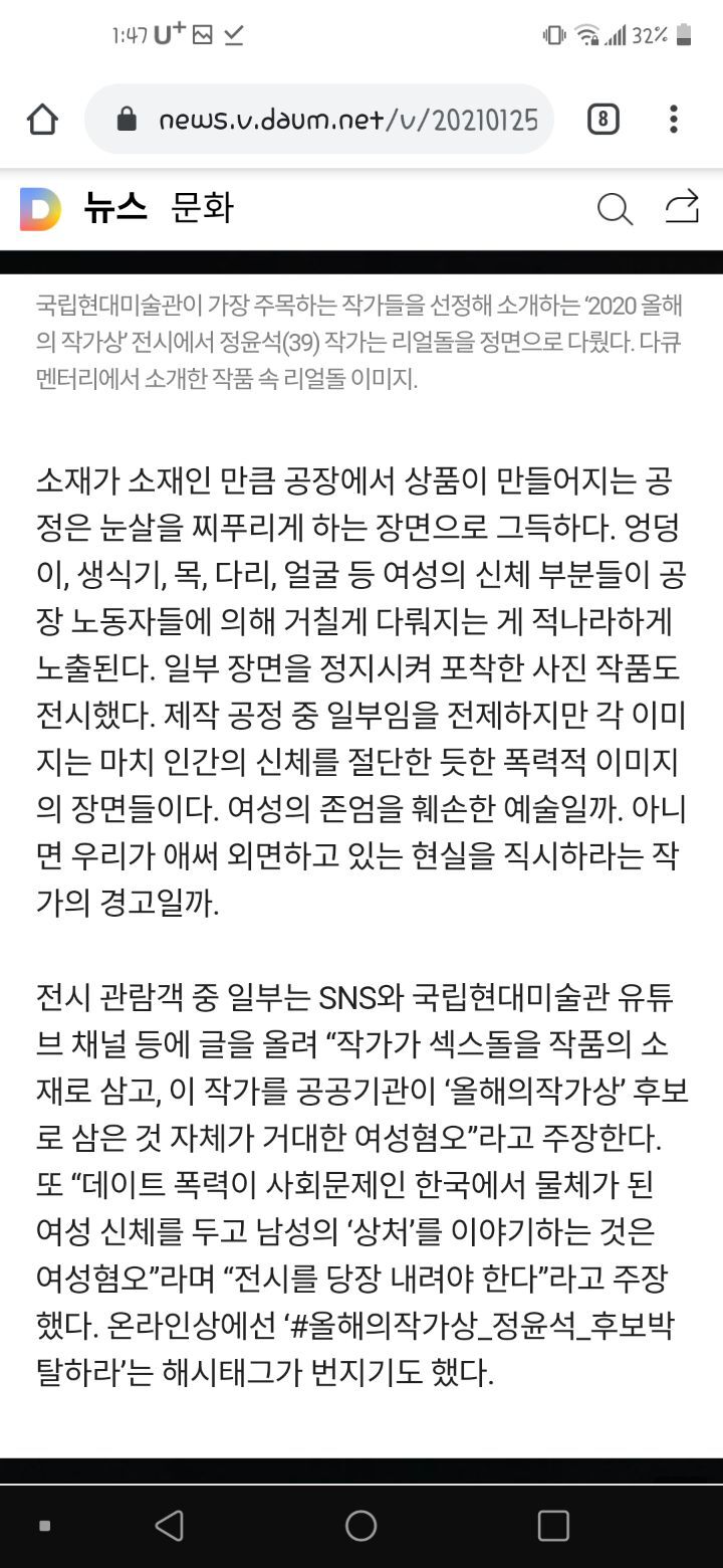 리ì¼ë ìì ì ë"¤ì´ì¤ ë²ì ê´ì¸ì² íìíê² ë¤ íê²½ë·ì»´ from img.hankyung.com 정윤석 작가 '내일' 전시 전경. 국립현대미술관 '2020 올해의 작가상' 후보로 오른 시각예술가이자 영화감독인 정윤석의 다큐멘터리 영화 '내일'의 한 부분이다. 주축을 이루는 한국근대기 명작 미술품들과 19세기 말~20세기 초 서양미술품 1천여점이 국립현대미술관에 기증된다. 2020년 12월 04일, 국립현대미술관과 sbs문화재단이 주최한 '올해의 작가상 2020' 후보 전시회에 정윤석 작가의 리얼돌 소재로 한 작품이 큰 논란이 되고 있다. 전시를 관람한 시민들이 국립현댄미술관 소셜미디어 계정에 전시중단을 요구했다. 온라인상에선 '#올해의작가상_정윤석_후보박탈하라'는 해시태그가 번지기도 했다. 논란의 리얼돌이 국립현대미술관 `올해의 작가상` 후보 정윤석의 2시간40분짜리 장편영화·설치 작품 `내일`의 주인공이다. 국립현대미술관은 2020년 12월 4일 올해의 작가상 2020 전시회를 열어 4명의 후원 작가를 선정했으며 이 중 정윤석 작가는 '내일'이라는 작품의 다큐멘터리를 상용했는데 이 다큐멘터리가 비판적 관점이 결여된 채로 섹스돌을 소재로 사용했다는 비판과 함께 논란이 되었다.1